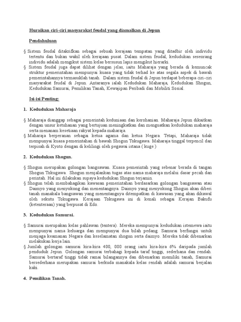 Ciri Feudal Jepun Docx Huraikan Ciri Ciri Masyarakat Feudal Di Jepun Pada Abad Ke 16 Dan17 Sistem Feudal Ditakrifkan Sebagai Sebuah Kerajaan Tempatan Course Hero